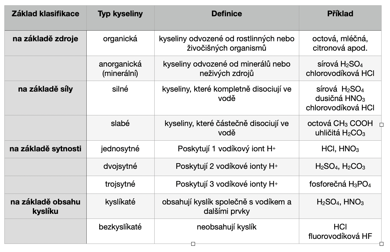 Takže se vrátíme k úplným základům a popíšeme si, snad dostatečně přehledně, jak kyseliny kategorizujeme nebo jinak řečeno, jaké typy kyselin známe.